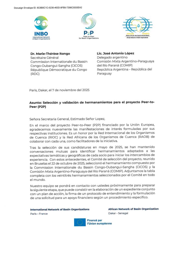 La Comisión Mixta Argentino-Paraguaya del Río Paraná (COMIP) fue seleccionada por la Red Internacional de los Organismos de Cuenca (RIOB) y la Red Africana de los Organismos de Cuenca (RAOB) para participar en el programa Peer-to-Peer (P2P), una iniciativa financiada por la Unión Europea que promueve el intercambio técnico y la cooperación entre organismos de cuenca de todo el mundo.